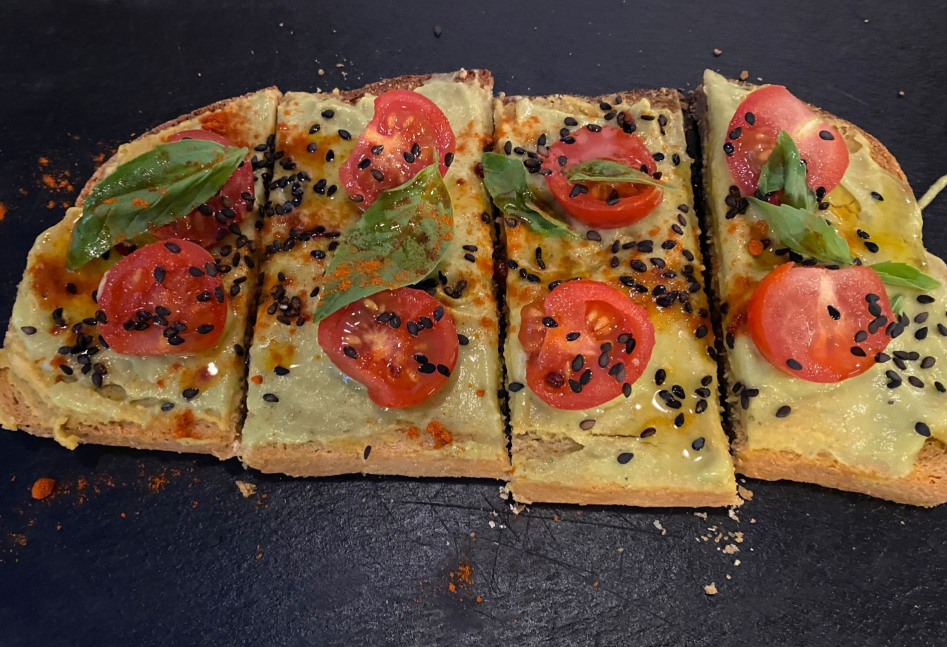 Tostada de pan cateto hecho en horno de leña, acompañada de guacamole, humus, tomate fresco, albahaca o cilantro y semillas de sesamo.